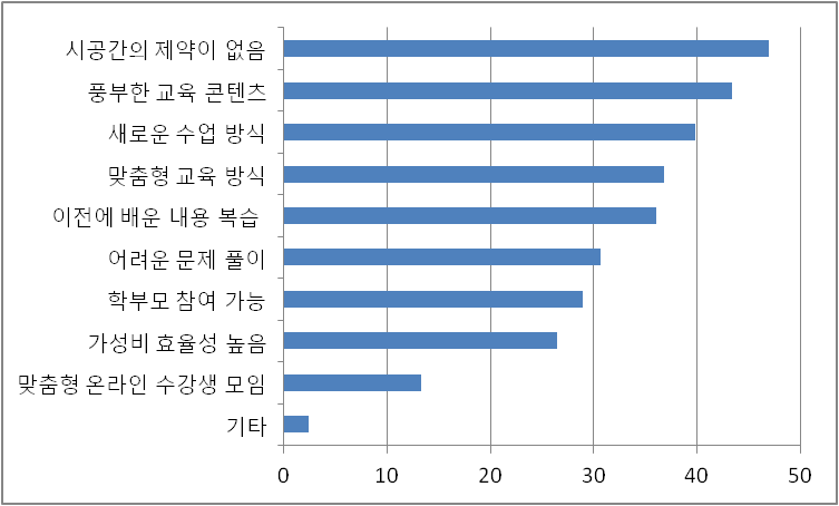 ㅇ 2018년 12월 iiMedia Research에서 발표한 '2018년 중국 온라인 교육 시장 백서'에 따르면 온라인 교육 이용자를 대상으로 온라인 교육 이용 목적에 대해서 설문조사한 결과, 이용자 중 47%는 "언제, 어디서나 공부할 수 있어서"라고 답했고, 43.4%는 "수업 콘텐츠가 풍부해서"라고 답함.