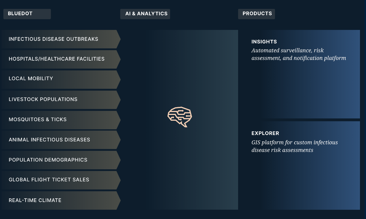 캐나다의 인공지능 플랫폼인 블루닷(BlueDot)은 세계 최초로 코로나19가 2020년 초에 세계적인 규모의 팬데믹 현상을 일으킬 것이라고 예측해 주목받은바 있다. 블루닷은 전 세계 65개국의 뉴스, 병원 시설 현황, 지역 이동 데이터, 가축 및 동물의 데이터, 해충 현황, 국제 항공 이동 데이터, 실시간 기후 변화 관련 대규모의 데이터를 수집하고 이를 인공지능 기술로 분석한 후 해당 결과를 의학·역학적 검토를 거쳐서 각국 정부 및 공공 보건분야 전문가들에게 전달하는 인공지능 플랫폼 기업이다.