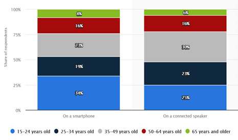 - 프랑스 저작권 보호 최고 협의기관인 HADOPI가 조사한 결과에 따르면 스마트폰에 탑재된 인공지능 음성인식 플랫폼은 15~24세(34%), 인공지능 스피커는 35~49세(30%)의 이용자가 가장 많음.