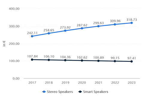 - 2019년 인공지능 스피커의 평균 가격은 104.36유로로 처음 출시된 2017년보다 약 3유로 저렴해짐.