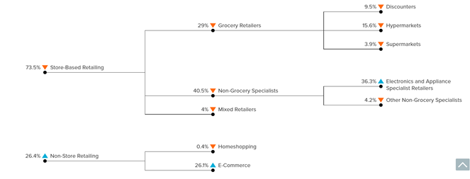 - 시장조사 업체 유로모니터(Euromonitor)의 조사에 따르면 프랑스내 인공지능 스피커의 73.5%가 오프라인 시장에서 유통되며 그 중 전문 매장이 40.5%, 식료품 및 잡화점이 29%의 점유율을 차지함.