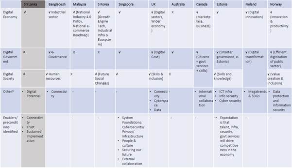 스리랑카 정부는 2020년에서 2025년까지 ‘디지털 정부’와 ‘디지털 경제’라는 정책을 바탕으로 행정의 투명성과 경제 성장률을 높이고자 한다. 정부는 디지털 주민등록증 도입, 핀테크(온라인 가상 금융 시스템), 헬스테크(온라인 진료 및 진료 기록의 전산화), 디지털 운송(자율 주행/ 디지털 신호/ 전자 티켓/ 대중 교통 전산 시스템), 법원과 경찰청을 포함한 핵심 부처의 전산화, 공공 와이파이를 도입하고, 벤처기업과 중소기업이 디지털 업무방식으로 경제 성장을 이루기 바란다. 더불어, e-러닝 시스템을 전국적으로 통합하여 지역 간 거리와 관계없이 모든 학생이 동일한 수준의 교육 내용을 접할 수 있기를 기대하고 있다. 결국 e-정부를 설립하여 시민들에게 제공해야 할 서비스의 질과 효용성을 높이고자 한다.