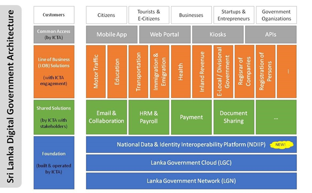 스리랑카의 e-정부 정책은 2009년도에 처음 내각 승인을 받아 2010-2012년동안 각 부처기관들에 시행령이 내려졌으며 ICTA(Information and Communication Technology Agency)에서 정책 검토 및 그 실행에 대한 모니터링을 담당하는데, 850개 이상의 정부 기관들을 Lanka Government Network(LGN)로 연결하고 Lanka Government Cloud(LGC)를 관리한다. 앞으로는 총 3,500개의 정부 조직을 연결하고, 전국의 우체국을 IT 네트워크로 연결하여 7,500여개의 지역을 와이파이 구역 설치와 함께 IT로 관할하고자 한다.