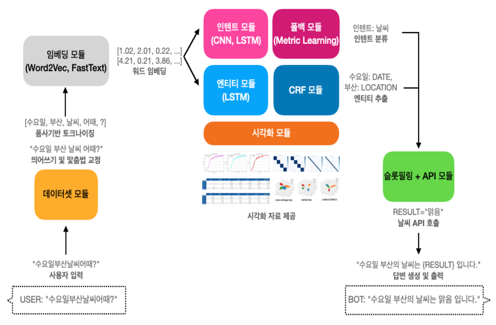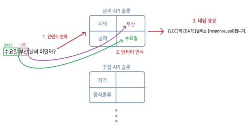 예를 들어, 사용자가 “수요일 부산 날씨 어때?”라 는 문장을 입력하면 인텐트 모듈은 이 문장을 날씨에 관련된 문장으로 분류하여 여러 슬롯 중, 날씨 API 를 호출하기 위한 슬롯을 선택합니다. 엔티티 모듈은 ‘수요일’을 날짜(DATE), ‘부산’을 장소(LOCATION)로 인식하여 날씨 API 슬롯을 채웁니다. 마지막으로 해당 API를 호출하여 결과를 사용자에게 반환합니다.