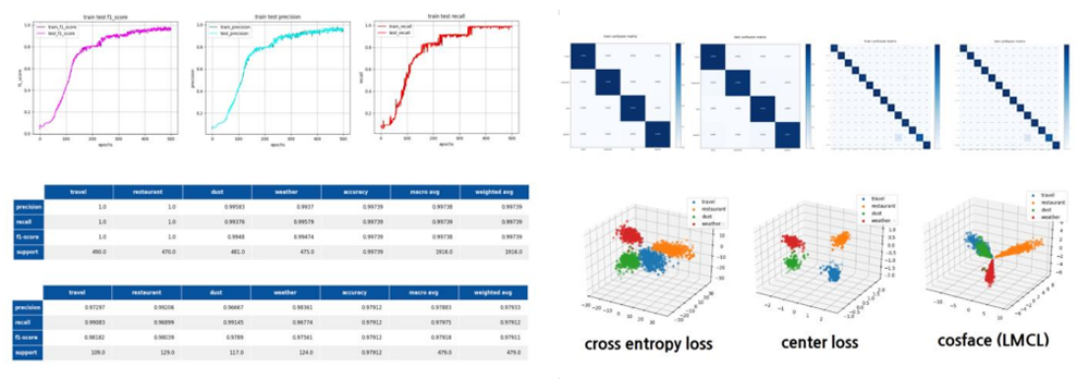 일반적으로 소프트맥스 기반의 분류를 수행 시에 모델로부터 출력되는 확률 값에 대한 임계치를 설정하여 분류 결과의 신뢰 여부를 판단할 수 있지만 다른 연구에 의하면 학습된 도메인 이외의 입력에 대하여 모델의 출력 확률값이 높다고 해서 그것이 높은 신뢰도를 의미하지는 않습니다. 따라서 Kochat에서는 이러한 문제를 해결하기 위해 메트릭 러닝 기법을 도입하였습니다.
